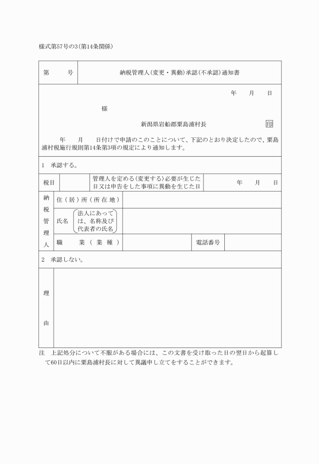 2 条例第14条第1項、第52条第1項、第95条第1項又は第119条第1項に規定する納税管理人の承認及び納税管理人を粟島浦村の区域外に住所等を有する者に変更しようとする場合その他承認を受けた事項に異動を生じた場合の承認を申請する場合の申告書の様式は、次に掲げるとおりとする。