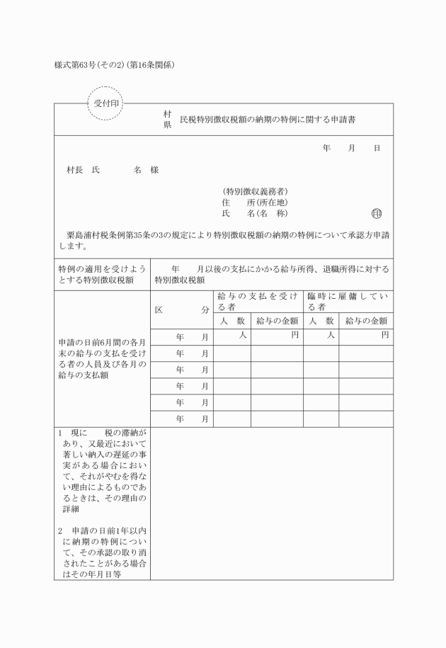 条例第35条の3 | /村/県/民税特別徴収税額の納期の特例に関する申請書 | 様式第63号(その2) |